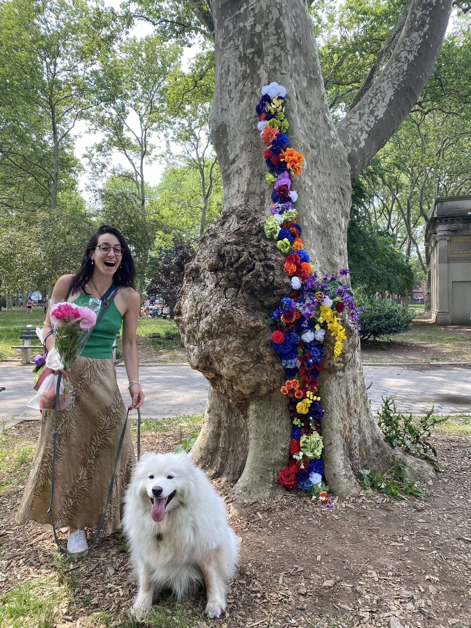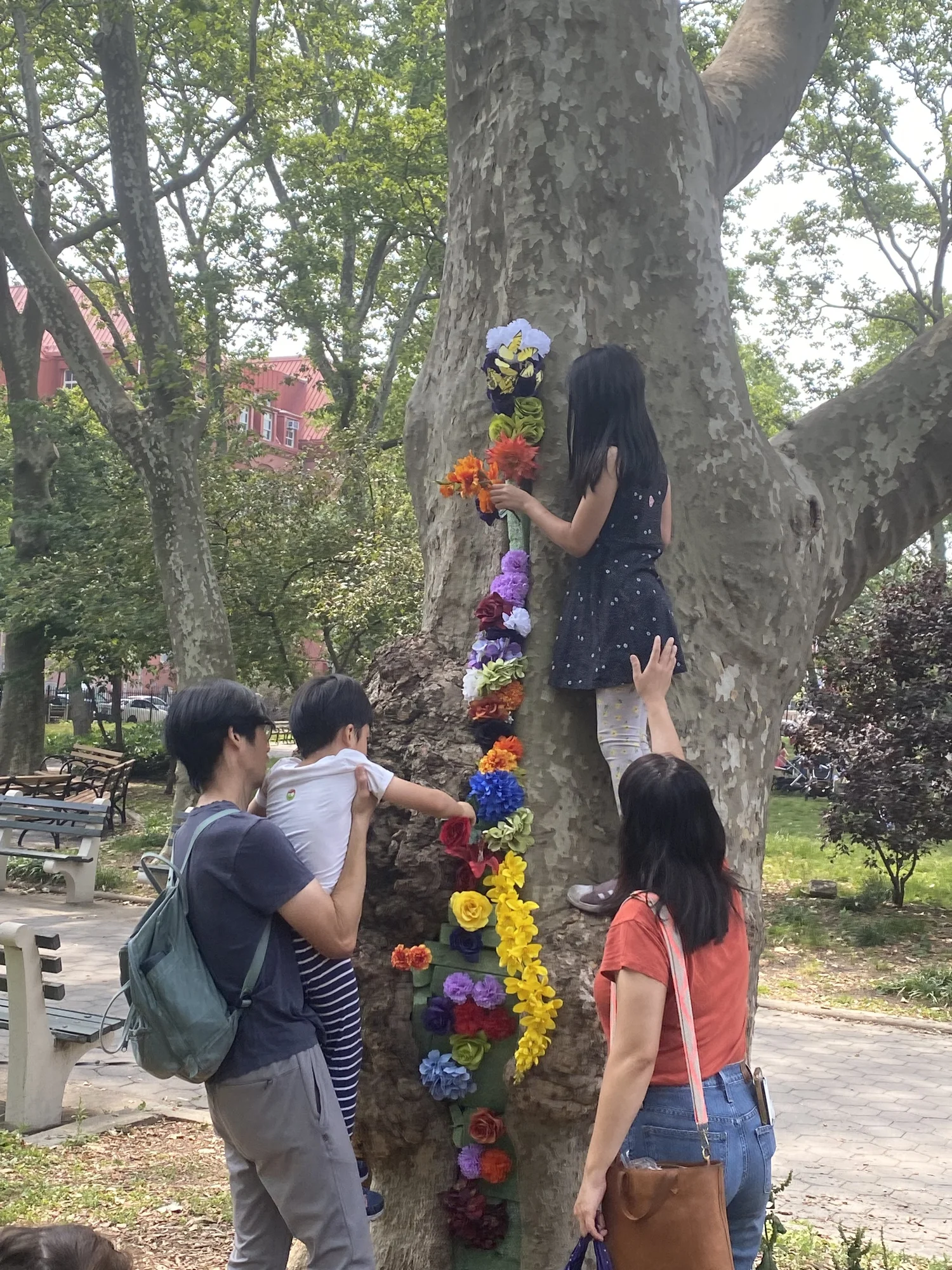 Site-specific installation with styrofoam, silk flowers, living tree, community participation, McGolrick Park, Brooklyn, NY, June 2023.